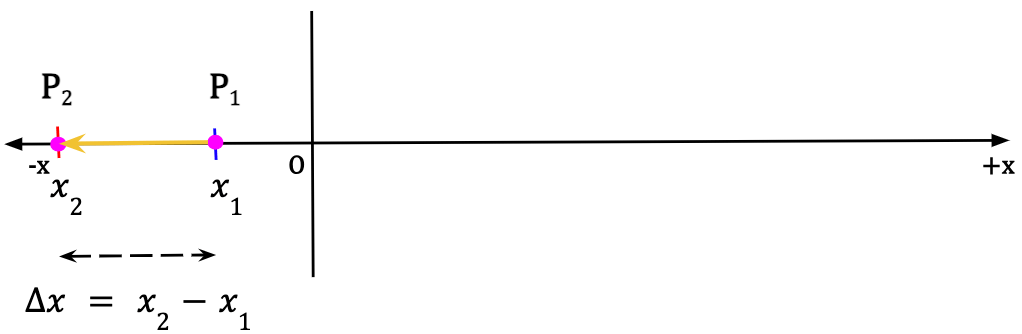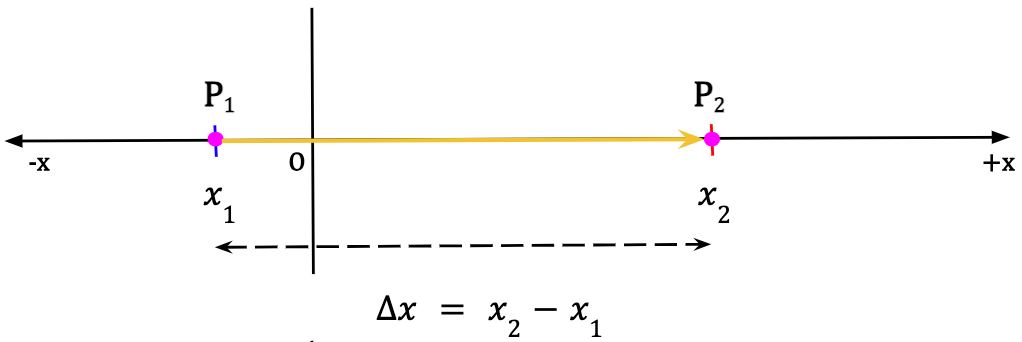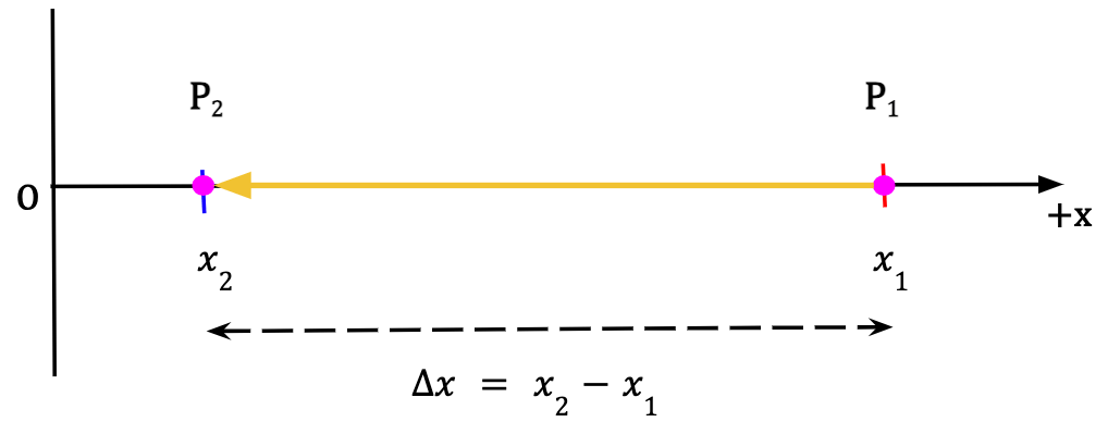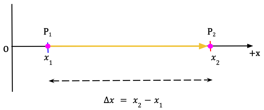 Consider a particle in 1D located at point P1 along the x-axis at time t1. After some time, the particle is found to be at point P2 at time t2. The component of the displacement vector along the x-direction is given by the change in the particle’s position which is equal to the difference between final position, given by the x-coordinate x2, and the initial position, given by the x-coordinate x1.