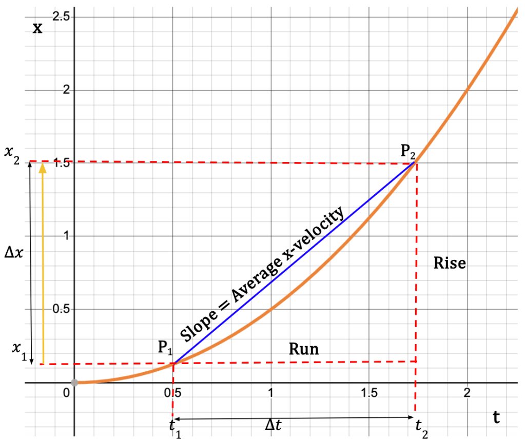 If in Figure 1, we start moving P2 closer to P1 such that Δx and Δt become infinitesimally small, the instantaneous velocity is given by the average x-velocity in the limit that Δt approaches zero, which is also called the derivative of x with respect to t.