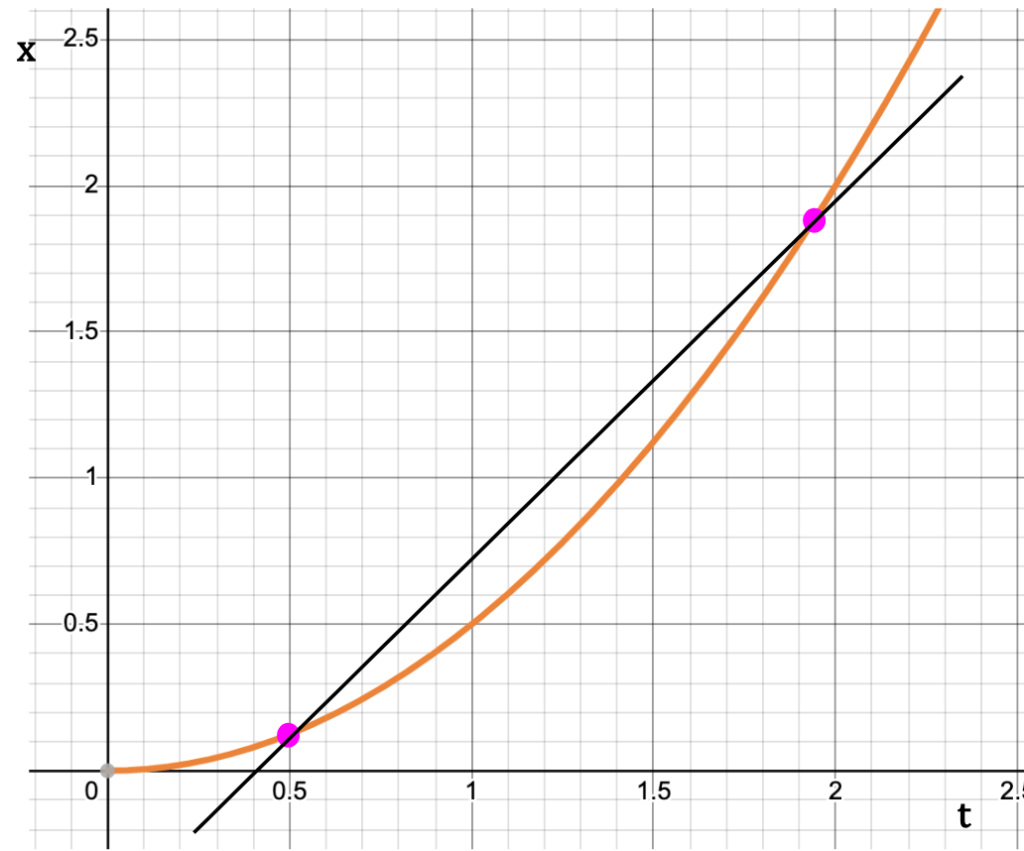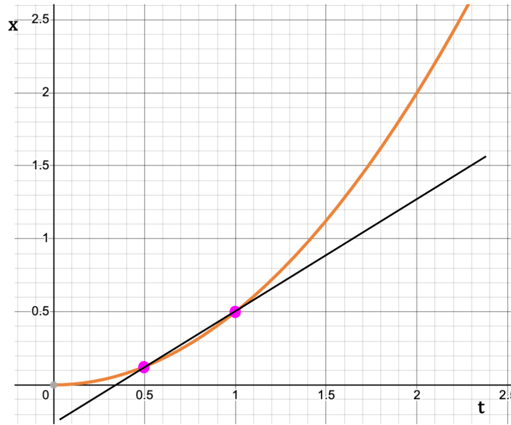 As the second point starts to approach the first one on x-t curve, the slope of the line between the two points approaches the slope of the tangent to the curve drawn at the first point (see below).