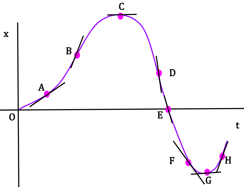 *Maximum and minimum on a curve simply describe the highest and lowest points on the curve indicative of the function flipping its direction. They do not correspond to maximum or minimum velocity of the particle. Velocity of the particle at both points is zero. At position C, the particle is farthest from origin along the positive x-axis and at position G, it is farthest from origin along the negative x- axis.