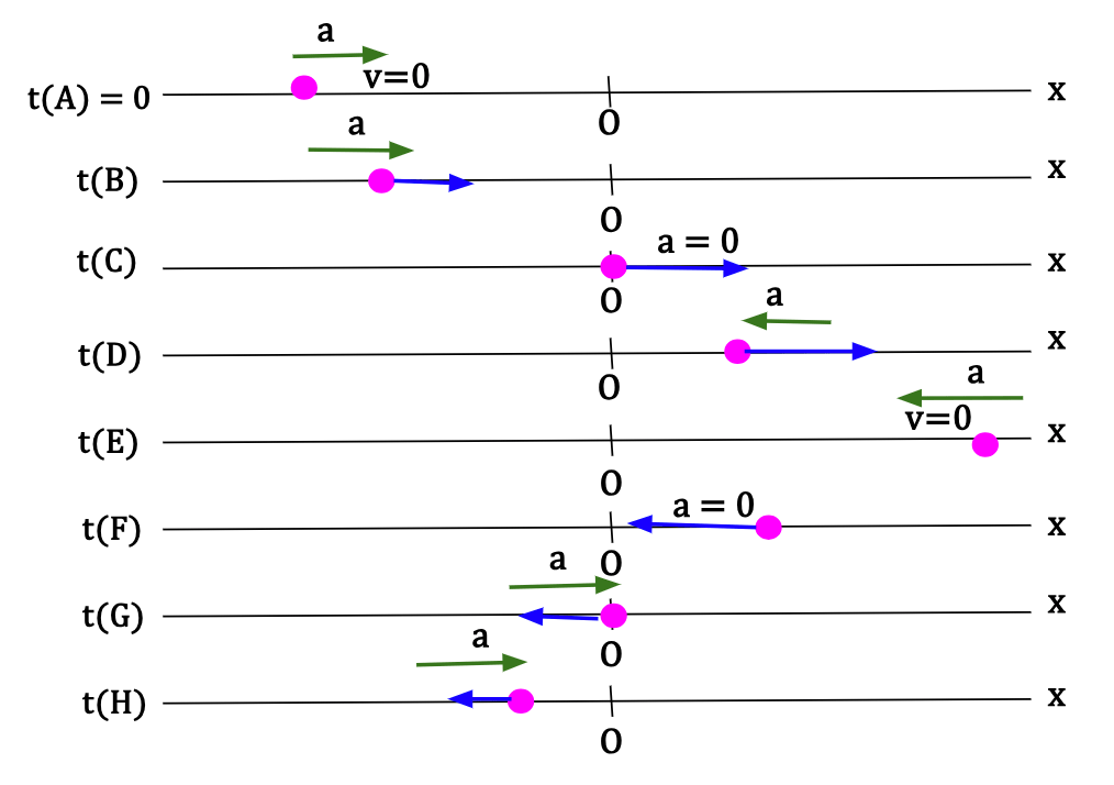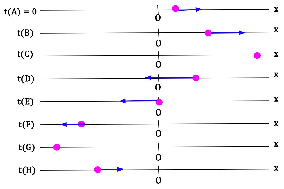 | G | On negative x-axis | Zero | Momentarily at rest | N/A | Particle reached a minimum on the curve* and momentarily vx = 0 |
