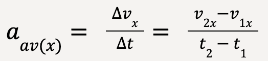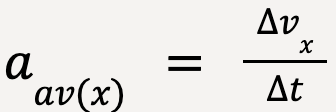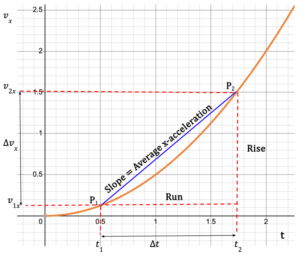 The average x-acceleration (or component of average acceleration in the x-direction) of the particle between points P1 and P2 is equal to the change in particle’s velocity, Δvx, divided by the time interval, , Δt = t2 – t1;