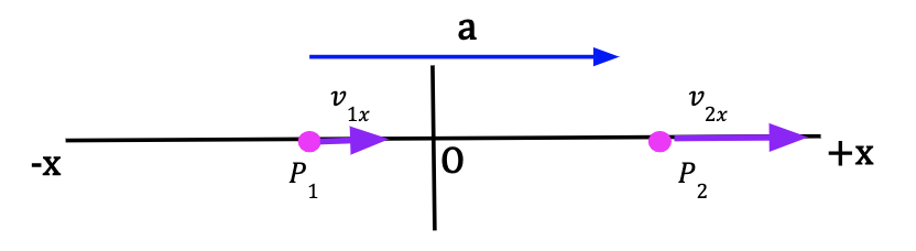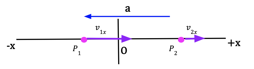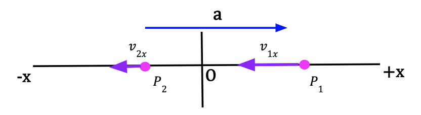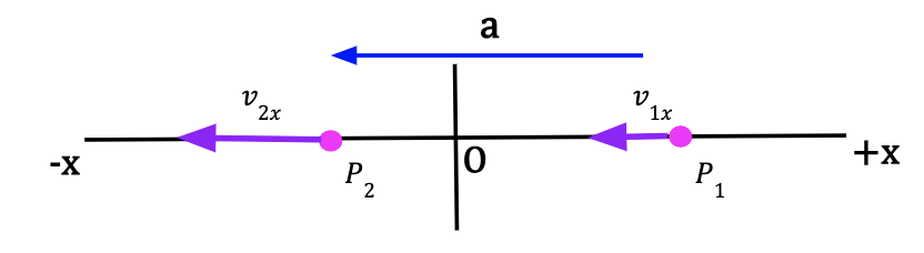 Consider a particle at point P1 moving along the x-axis with a positive x-velocity, v1x. After some time, the particle is at point P2 and the particle’s x-velocity is now negative. Since the particle’s initial x-velocity is positive and it became less positive, we can conclude that the average acceleration is negative and particle is now speeding up in the negative x-direction. At P2, the acceleration is in the same direction as the particle’s velocity at P2.