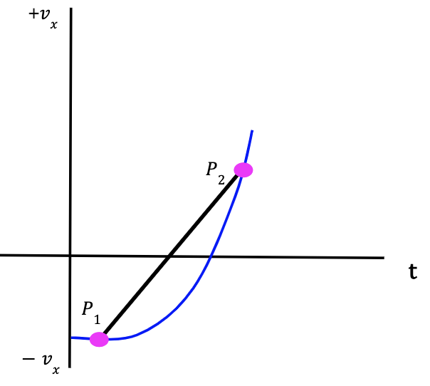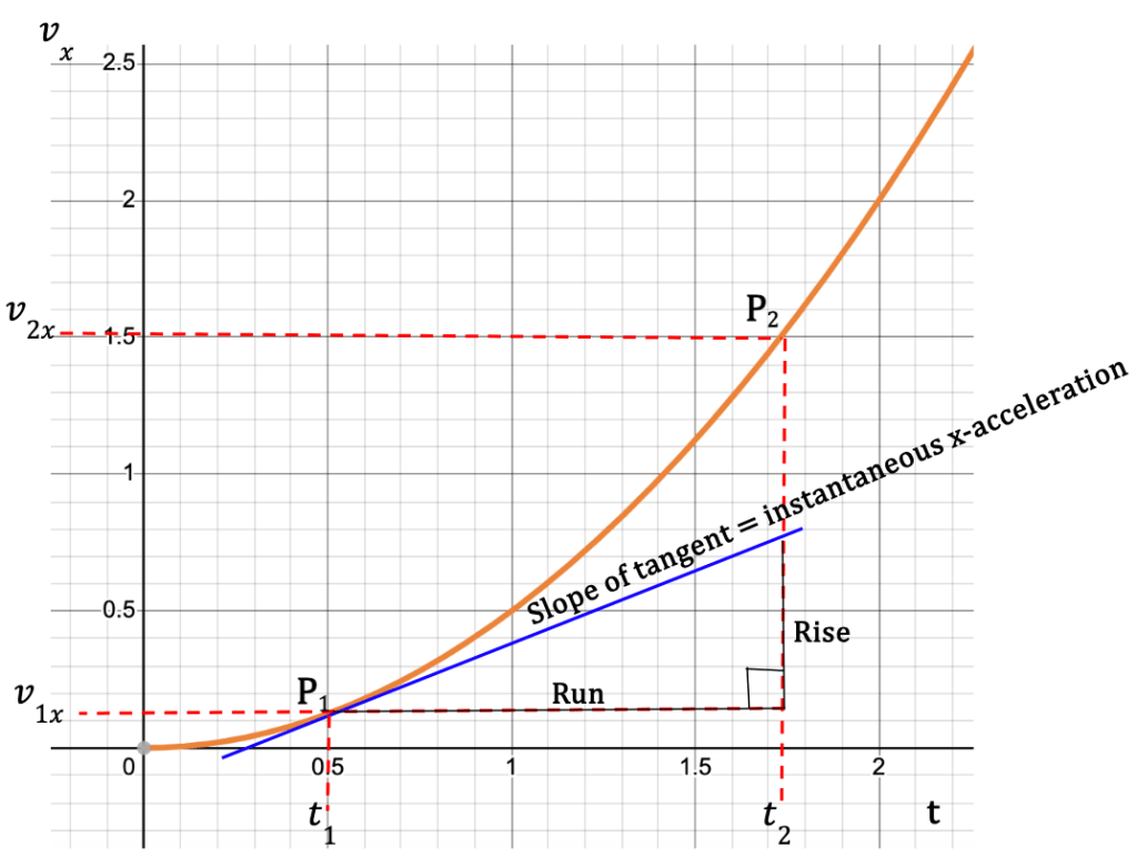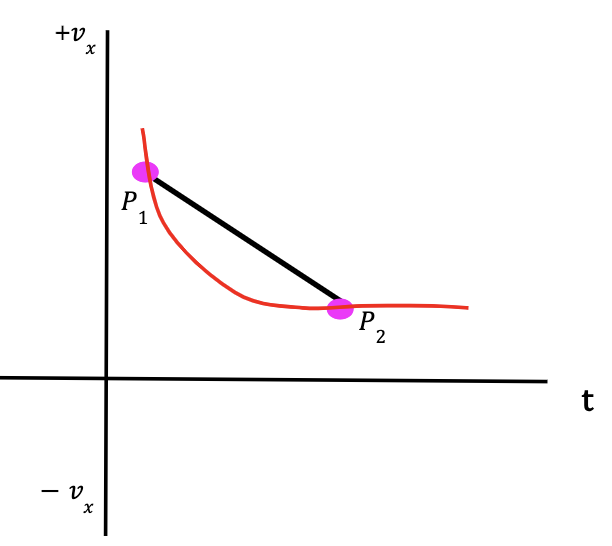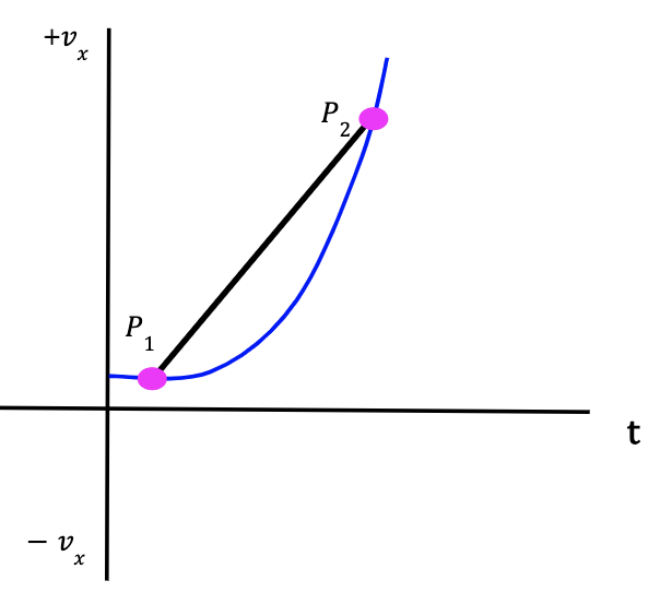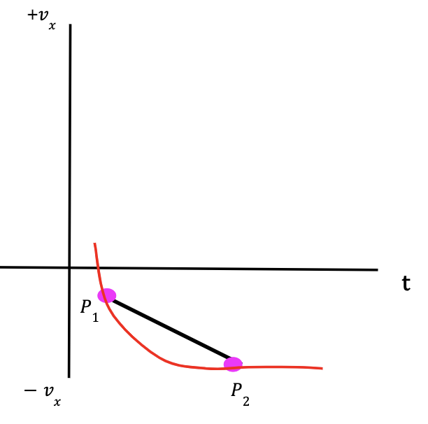 Figure 16: The vx-t curve provides the change in particle’s velocity with respect to time. At point P1, the particle has an x-velocity, v1x and at point P2, the x-velocity is given by v2x. The slope of the graph is equal to the average x-acceleration which is given by Δvx/Δt.