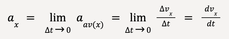 If in Figure 16, we start moving P2 closer to P1 such that Δvx and Δt become infinitesimally small, the instantaneous x-acceleration is given by the average x-acceleration in the limit that Δt approaches zero, which is also called the derivative of vx with respect to t.