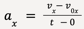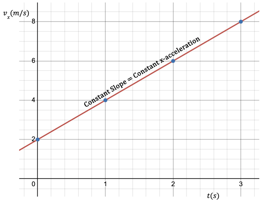 - Alternatively, slope = rise/run = axt/t = ax which makes sense because the slope of the line should equal the x-acceleration of the particle. ↩︎