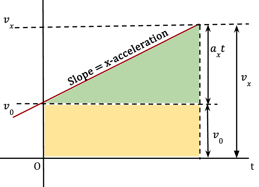 Comparing equation 15 to Figure 29, we can see that for constant acceleration, the area under the straight line on a vx-t graph is equal to the change in position or displacement of the particle (x-x0).