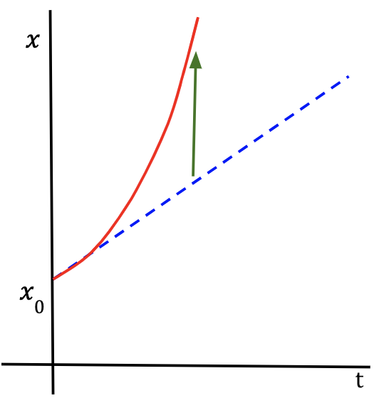 - The orange curve should not be mistaken to be the path taken by the particle, which is a straight line (yellow vector on the left). The curve represents the change in the particle’s position with respect to time. ↩︎