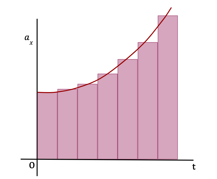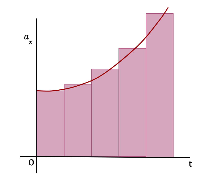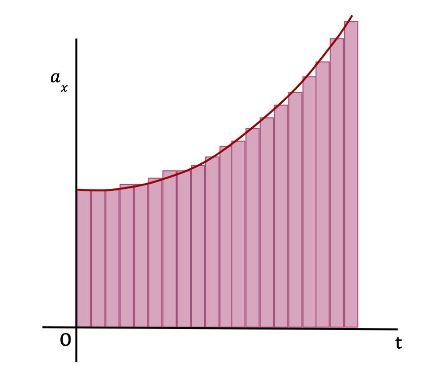 As Δt becomes really small and number of Δt’s become very large, the area of the rectangles approaches the area under the graph (See below). In other words, the average x-acceleration from any time t to t+Δt approaches the instantaneous x-acceleration, ax(t) at time t.