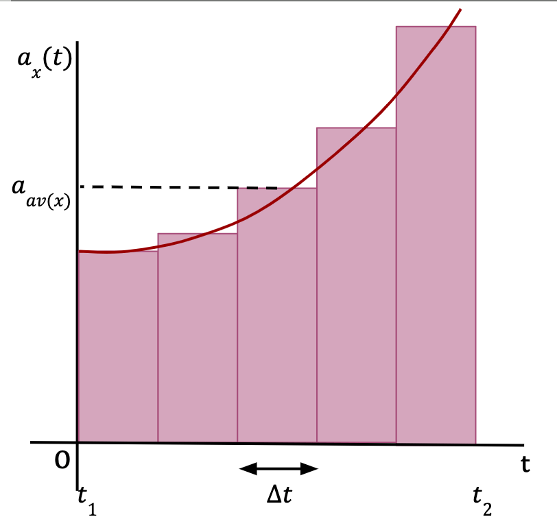 Consider a function of acceleration which varies with time, given by, ax(t). If the time interval from t1 to t2 is split into equal mini-intervals of Δt and aav(x) is the average acceleration for this time interval, Δt (as shown in Figure 34), then according to the definition of average acceleration;