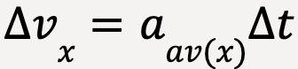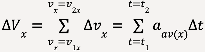 The total change in x-velocity of the particle between times t1 and t2 (ΔVx) is then equal to the sum of changes in x-velocity over each time interval Δt, which is approximately equal to the total area under the curve on an ax-t graph (see Figure 34). In other words;