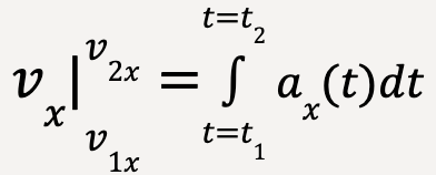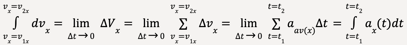 In the limit that Δt becomes negligible and the number of Δt’s become infinite, the area under the curve is equal to the integral of instantaneous x-acceleration from t1 to t2. In other words,